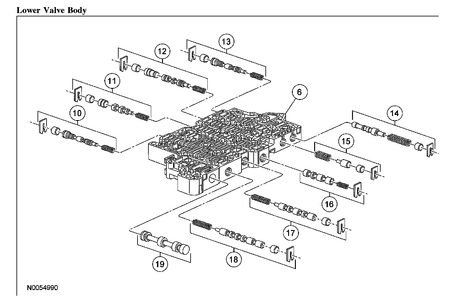 Remove the individual valves and springs from the main control valve body and lower valve body by removing the retaining clips. See the main control valve body assembly illustration for valve and spring locations. Clean valves, springs, main control valve body and lower valve body.