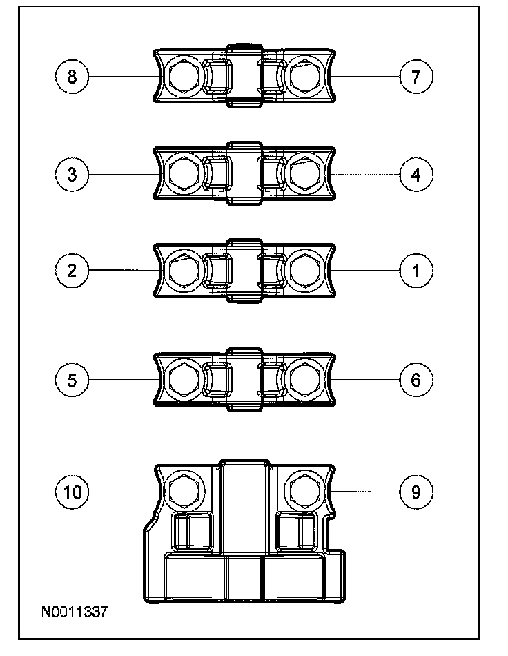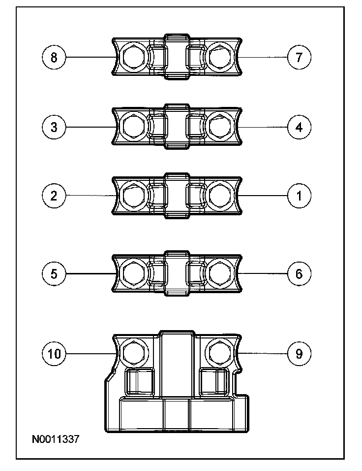 Remove the bolts in the sequence shown and remove the LH cylinder head front camshaft bearing cap and then the remaining bearing caps.