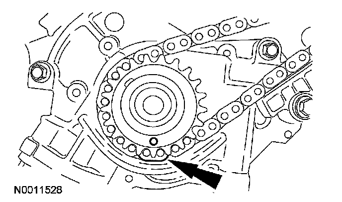 17. NOTE: The camshaft phaser and sprocket will be stamped with one of the illustrated timing marks for the RH camshaft.