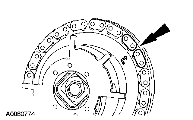 12. Position the lower end of the LH (inner) timing chain on the crankshaft sprocket, aligning the timing mark on the outer flange of the crankshaft sprocket with the single copper (marked) link on the chain.