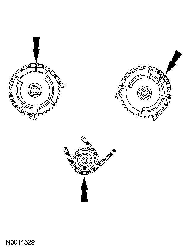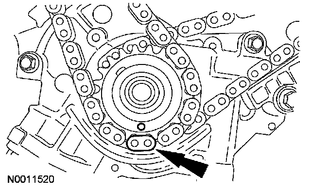 16. Position the lower end of the RH (outer) timing chain on the crankshaft sprocket, aligning the timing mark on the sprocket with the single copper (marked) chain link.