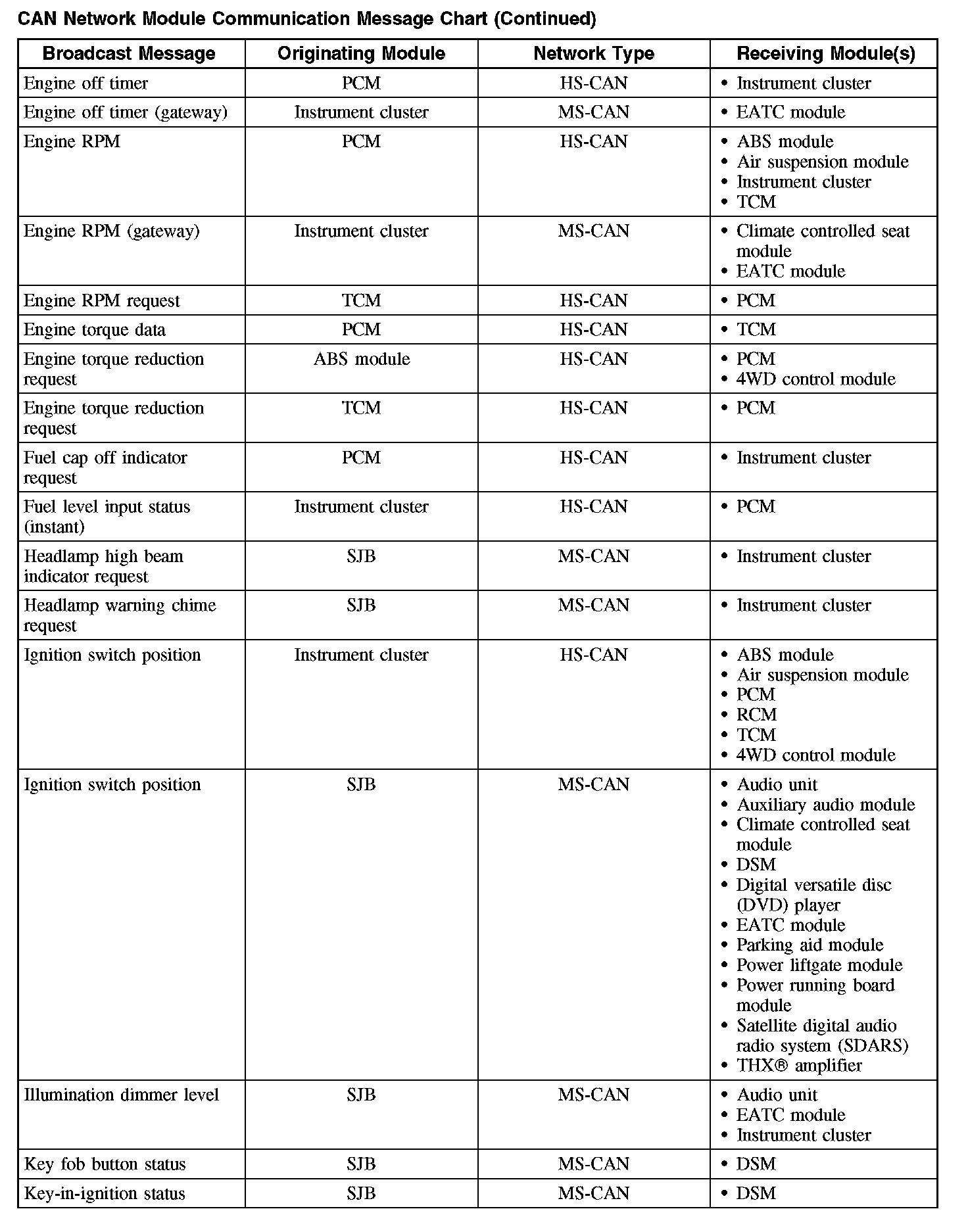 The chart describes the specific CAN network messages broadcast by each module, and the module(s) that receive the message: