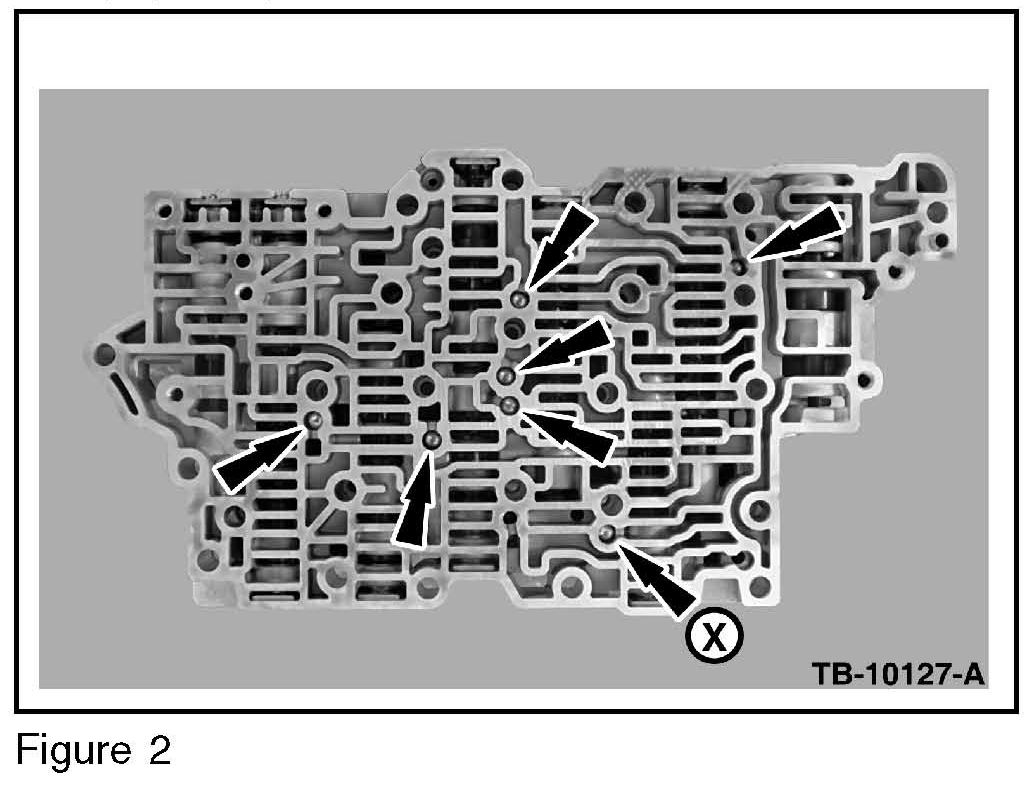 a. Proper check ball locations on the remaining six (6) valve body check balls shown with arrows. (Figure 2)