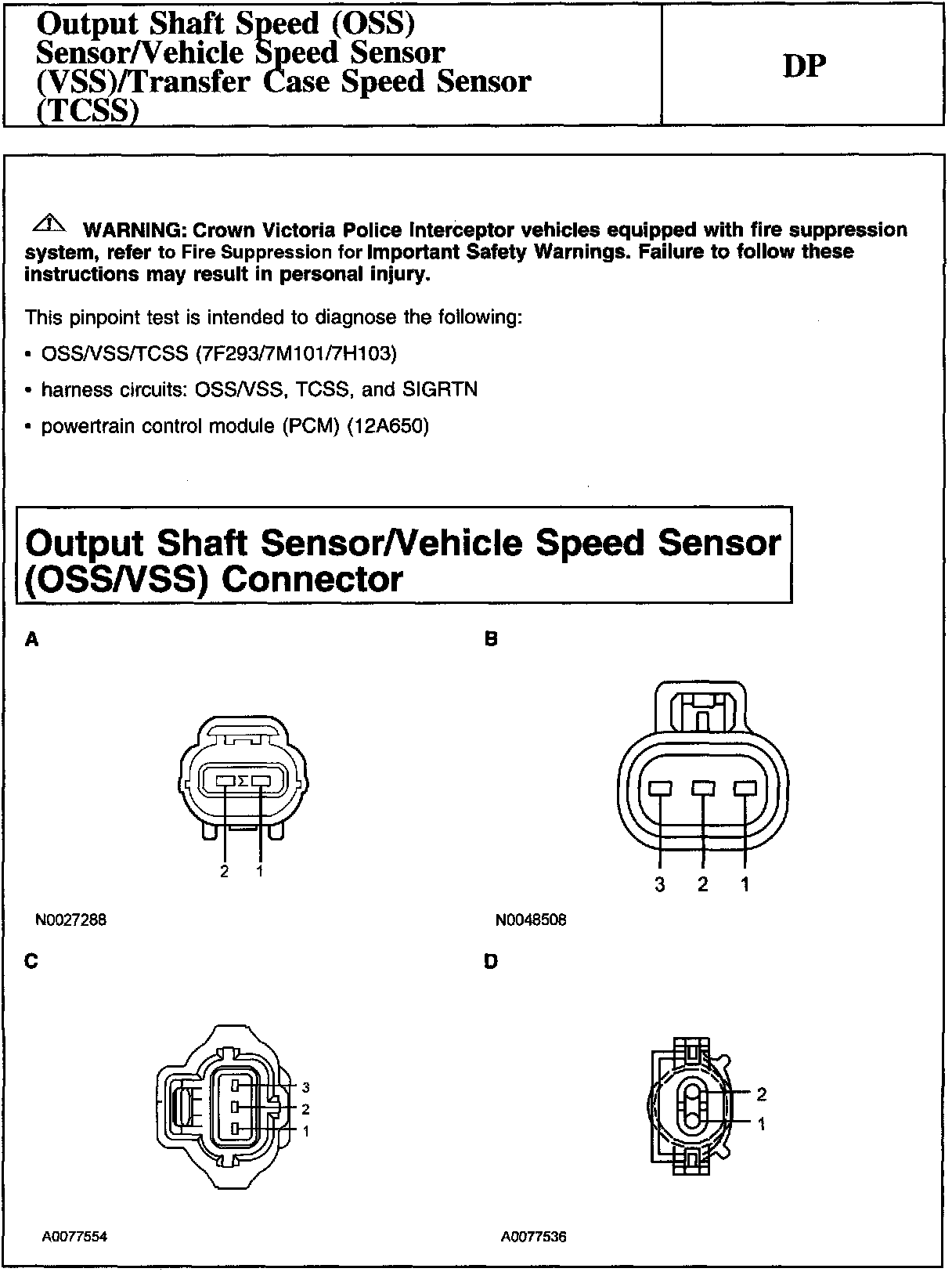 PINPOINT TEST DP: OUTPUT SHAFT SPEED (OSS) SENSOR/VEHICLE SPEED SENSOR (VSS)/TRANSFER CASE SPEED SENSOR (TCSS)