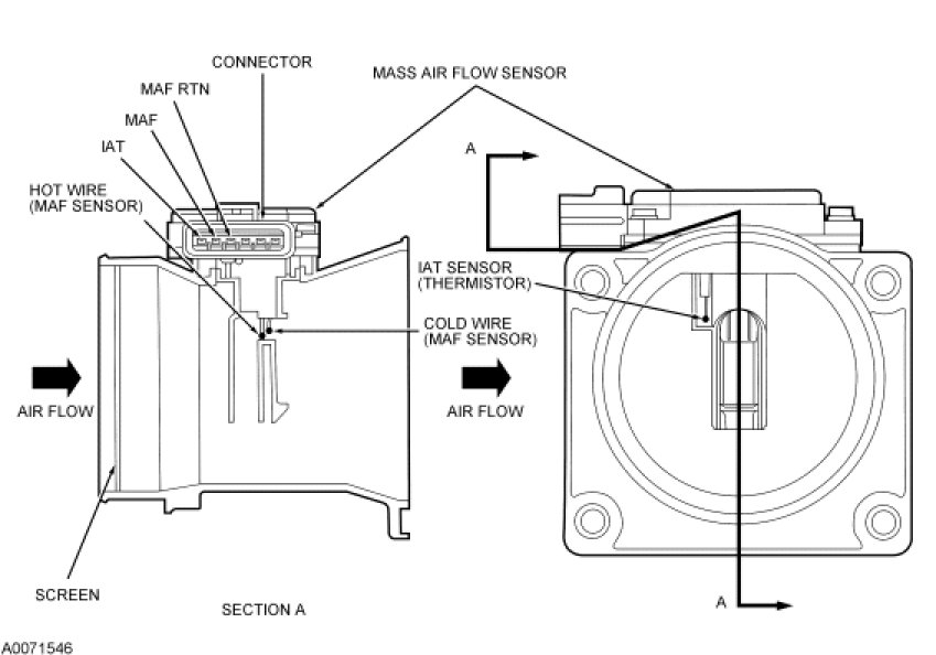 Diagram of Air Flow Through Throttle Body Contacting MAF Sensor Hot and Cold Wire (and IAT Sensor Wire Where Applicable) Terminals: