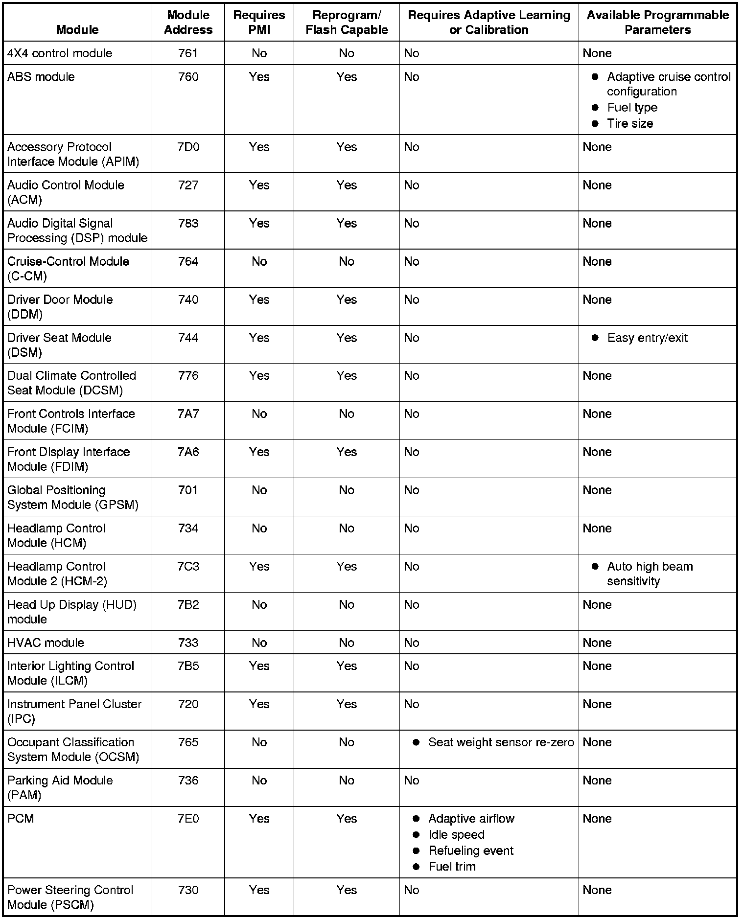 Programmable parameters are customer preference items that may be modified by the dealer via the scan tool or in some cases modified by the customer following a procedure listed in the Owner's Literature. While many configuration options may exist for a module, only a few of these options are programmable parameters.