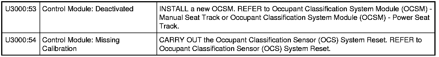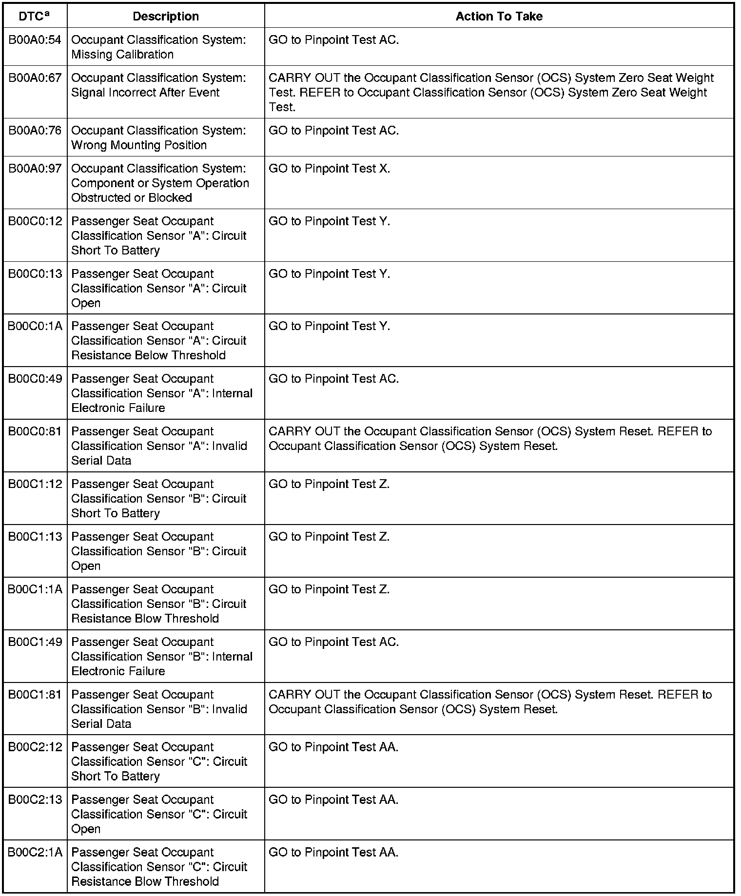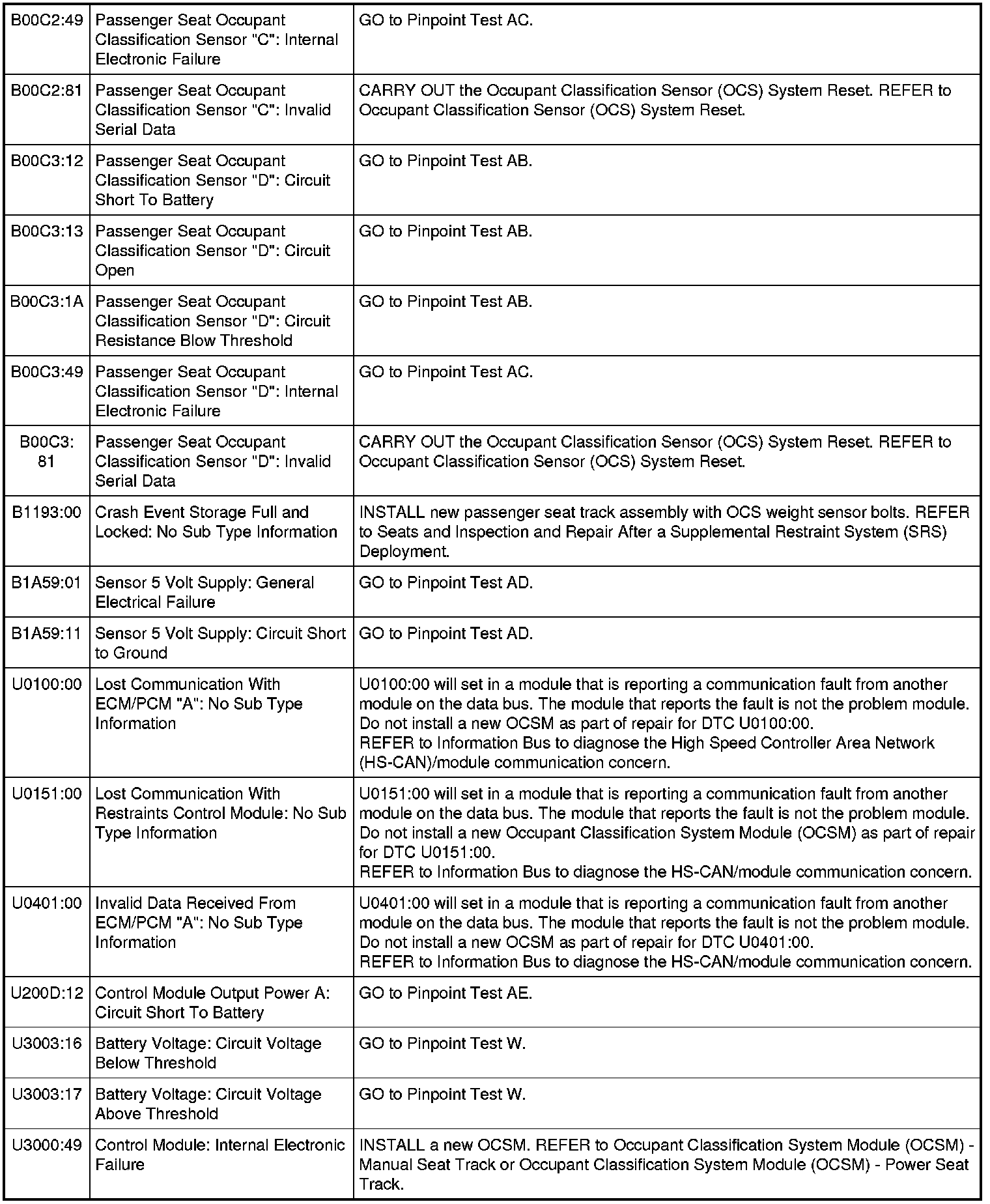 Home >> Lincoln >> 2010 >> MKX AWD V6-3.5L >> Repair and Diagnosis >> Restraints and Safety Systems >> Air Bag Systems >> Testing and Inspection >> Diagnostic Trouble Code Tests and Associated Procedures >> Occupant Classification System Module (OCSM) DTC Chart