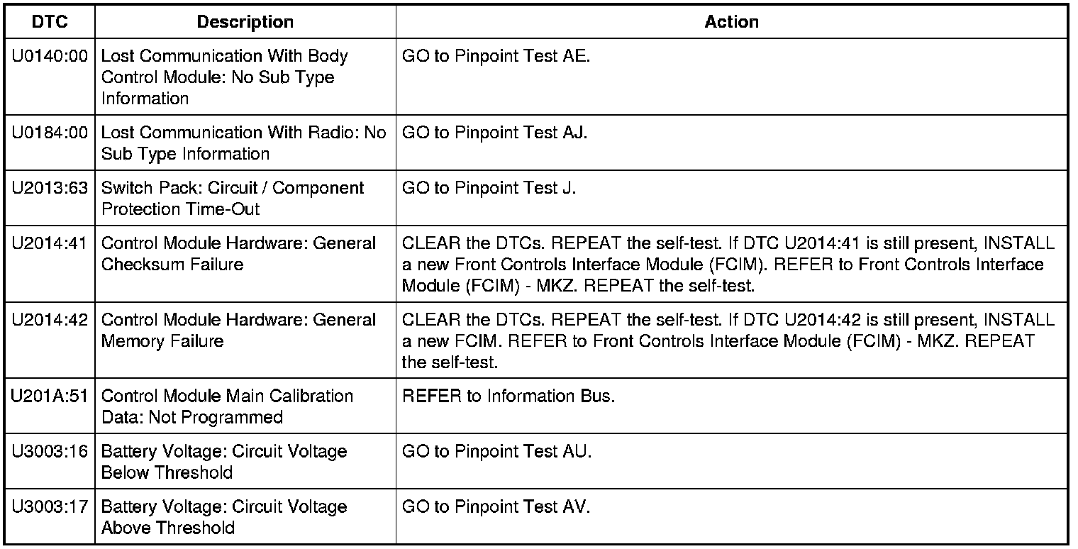 Front Controls Interface Module (FCIM) DTC Chart - MKZ Without Navigation, All Vehicles With Navigation