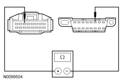 - Measure the resistance between the 4X4 control module C460-3, circuit VDB04 (WH/BU), harness side and the Data Link Connector (DLC) C251-6, circuit VDB04 (WH/BU), harness side.