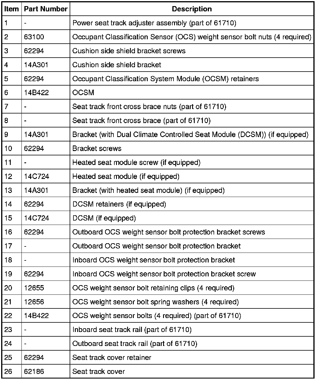NOTE: To install a new Occupant Classification System Module (OCSM) or an Occupant Classification Sensor (OCS) weight sensor bolt, refer to the appropriate procedure in Supplemental Restraint System Removal and Replacement or Service and Repair.