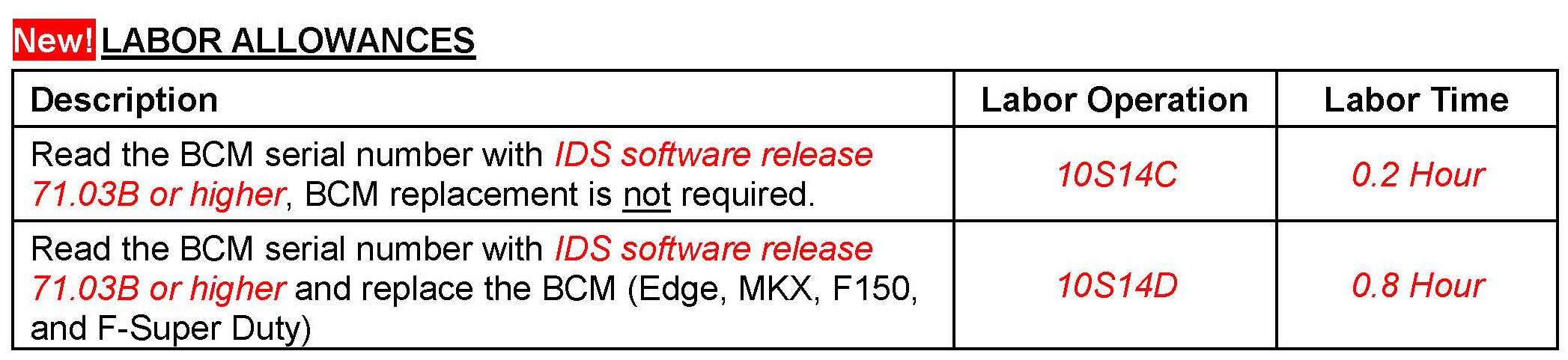 Home >> Lincoln >> 2011 >> MKX AWD V6-3.7L >> Repair and Diagnosis >> Powertrain Management >> Computers and Control Systems >> Relays and Modules - Computers and Control Systems >> Body Control Module >> Technical Service Bulletins >> All Technical Service Bulletins >> Recall - Body Control Module Replacement >> Attachment II - Labor and Parts Information