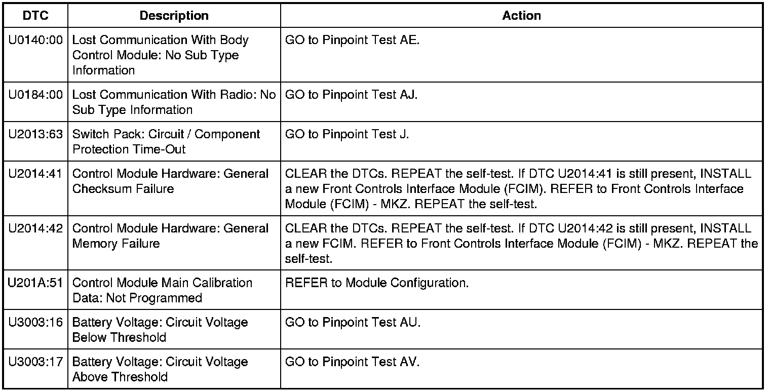 Front Controls Interface Module (FCIM) DTC Chart - MKZ Without Navigation, All Vehicles With Navigation