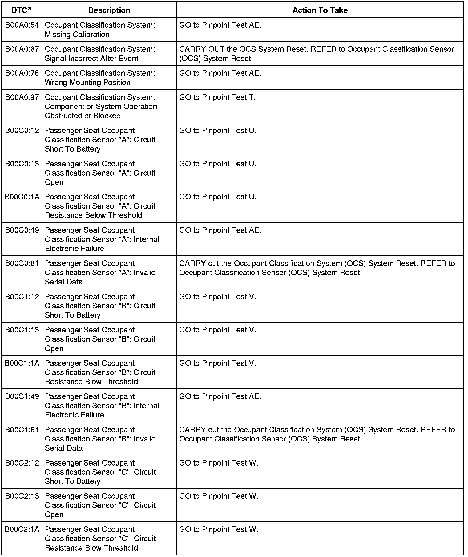 Home >> Lincoln >> 2011 >> MKZ AWD V6-3.5L >> Repair and Diagnosis >> Restraints and Safety Systems >> Air Bag Systems >> Testing and Inspection >> Diagnostic Trouble Code Tests and Associated Procedures >> Occupant Classification System Module (OCSM) DTC Chart