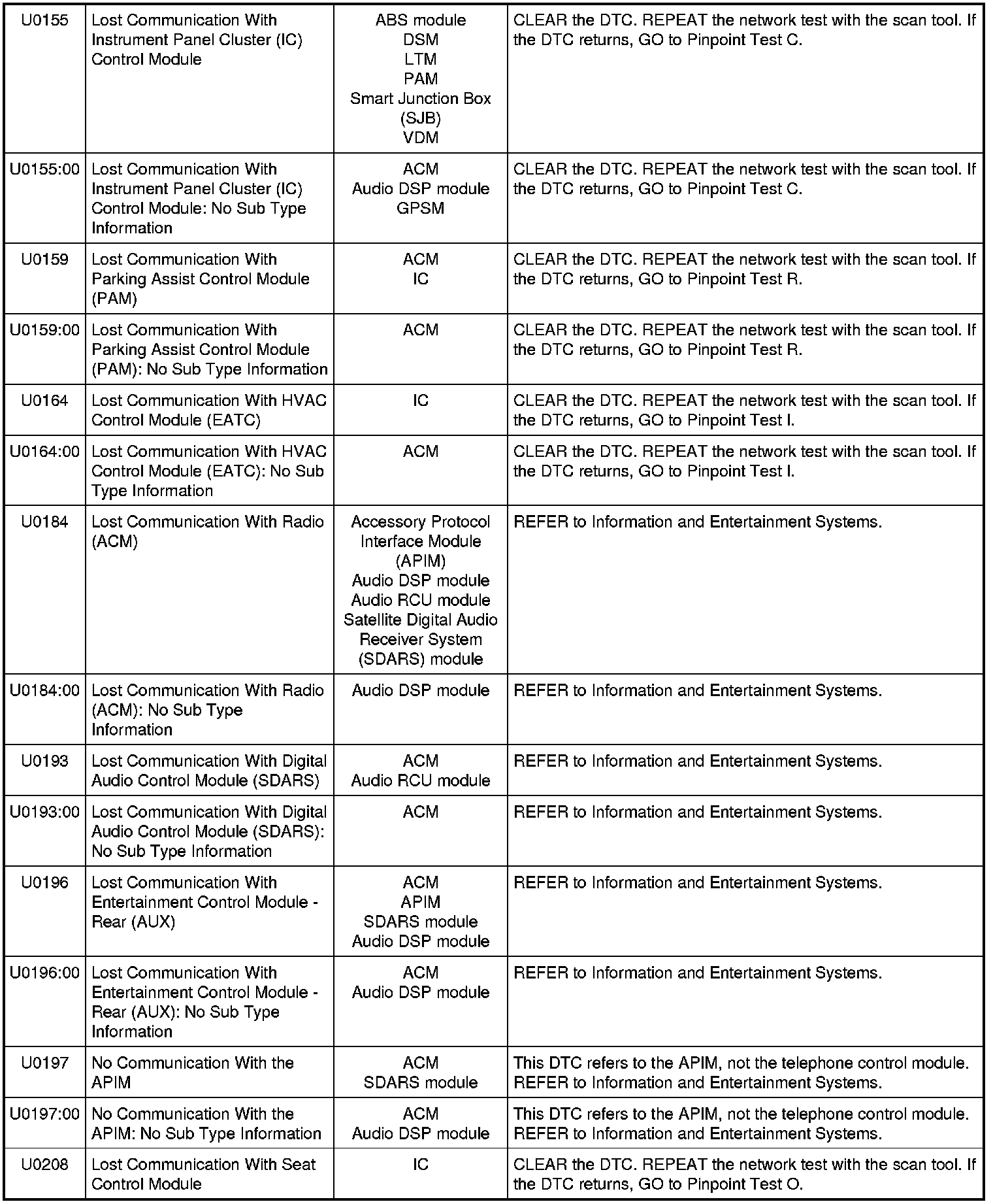 NOTE: Network DTCs (U-codes) are often a result of intermittent concerns such as damaged wiring or low battery voltage occurrences. Additionally, vehicle repair procedures such as module reprogramming often set network DTCs. Replacing a module to resolve a network DTC is unlikely to resolve the concern. To prevent repeat network DTC concerns, inspect all network wiring, especially connectors. Test the vehicle battery, refer to Battery, Mounting and Cables Testing and Inspection.