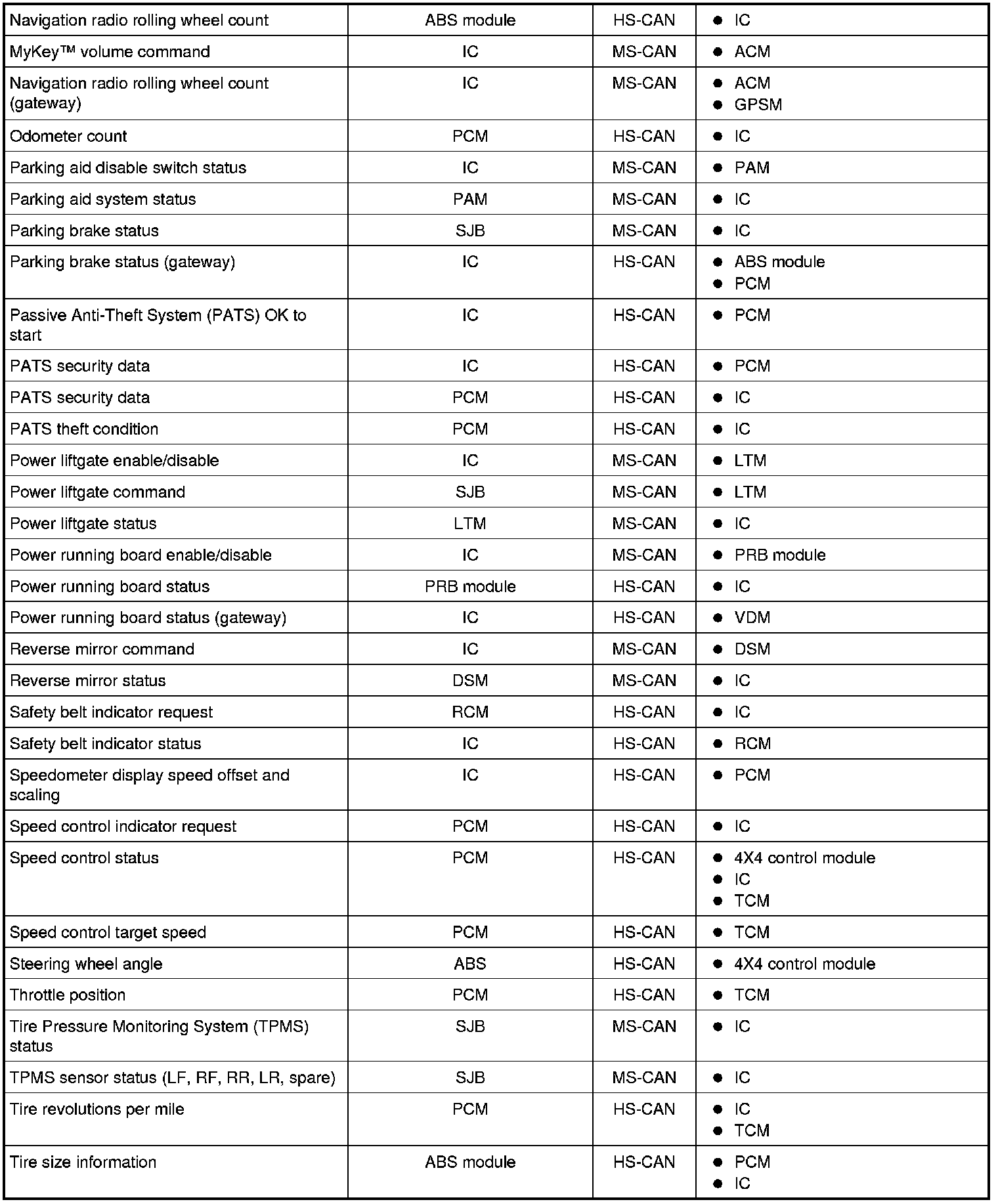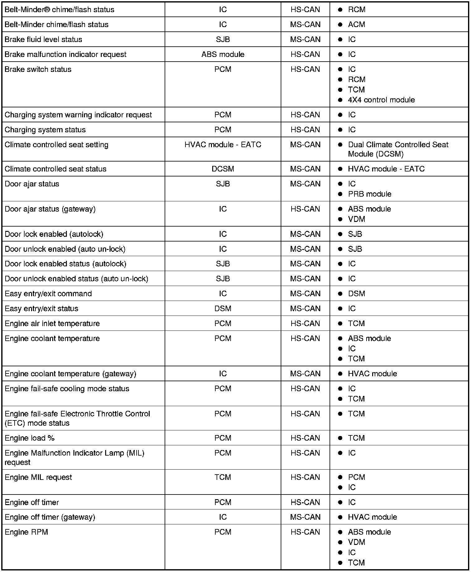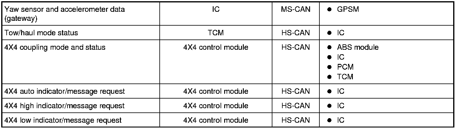 NOTE: This chart describes the specific HS-CAN and MS-CAN messages broadcast by each module, and the module(s) that receive the message.