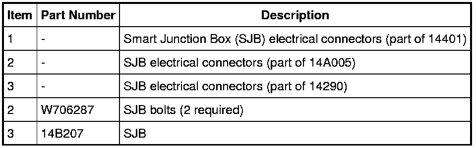 NOTE: Prior to the replacement of the module, it is necessary to upload the module configuration information to a scan tool. This information must be downloaded into the new Smart Junction Box (SJB) after installation. For additional information, refer to Module Configuration Programmable Module Installation (PMI). In the event that As-Built data entry is required (SJB will not communicate), all Remote Keyless Entry (RKE) devices must be programmed to the new SJB. A minimum of 2 devices are necessary to complete the configuration and turn off the flashing interior lights.