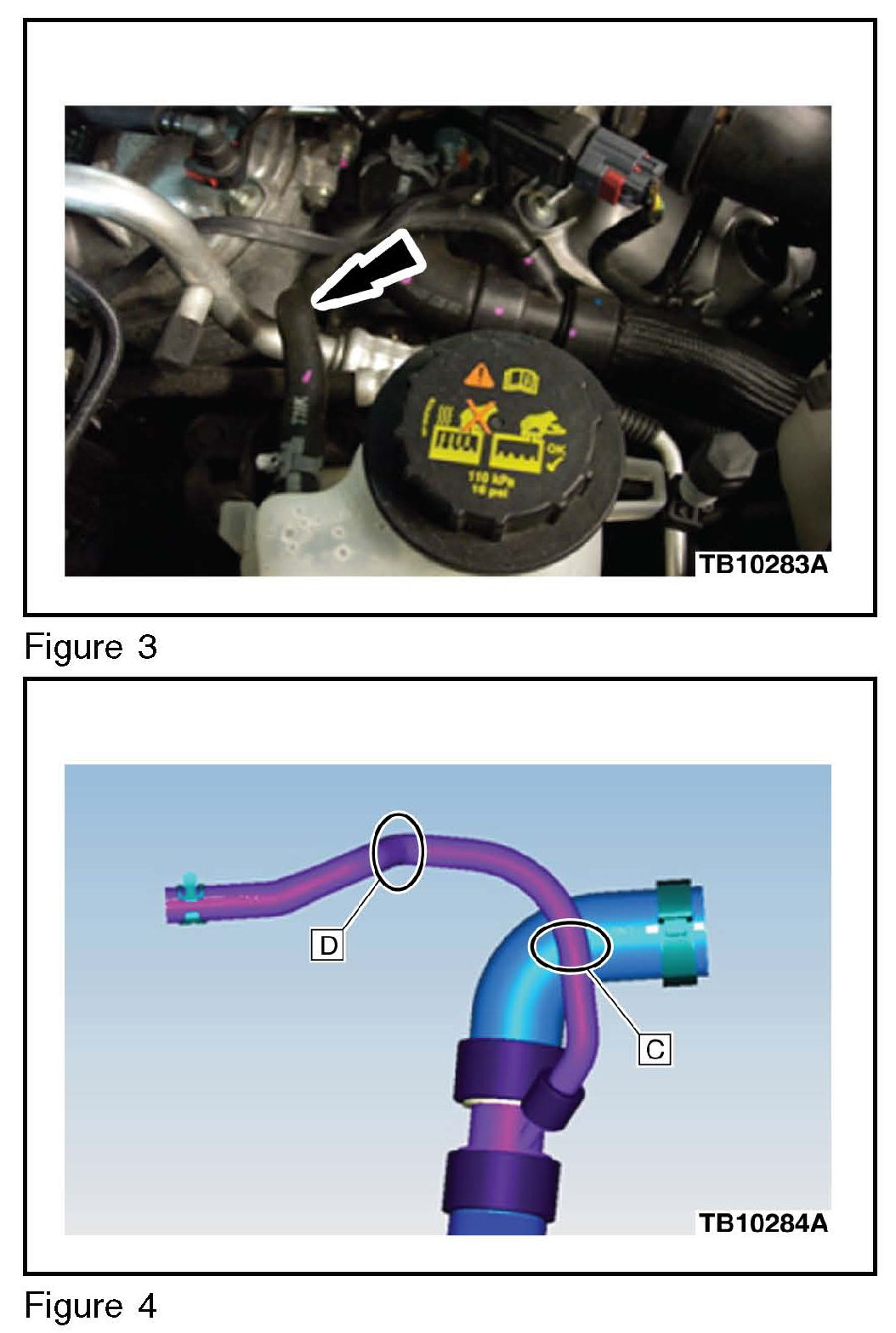 2. Inspect check valve location in vent hose. On 3.5L GTDI engine, vent hose runs from upper radiator hose to degas bottle. On 3.5L/3.7L TiVCT engine, vent hose runs from thermostat housing to degas bottle. Squeeze hose with fingers to verify location.