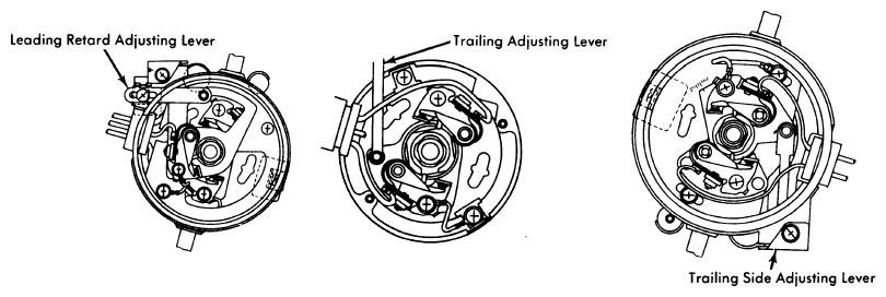 - Connect timing light to trailing (top) spark plug on front housing. Start engine and check trailing timing. See Fig 1. Use external adjusting lever, loosen vacuum unit attaching screws, or loosen leading side breaker base assembly to adjust trailing timing. See Figure.