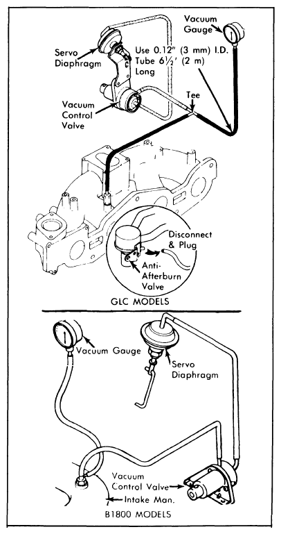 - On GLC, disconnect and plug vacuum hose from anti-afterburn valve. Disconnect vacuum tube going from vacuum control valve to intake manifold, at manifold, and connect a vacuum gauge to it. See Fig 2.
