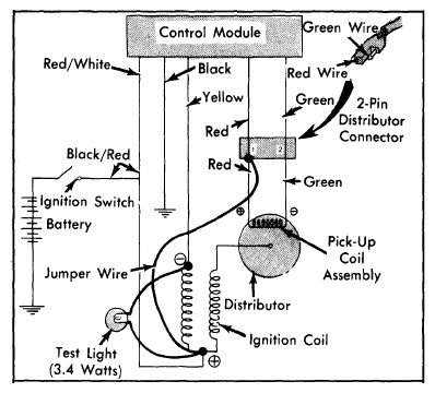 - Connect test light (3.4 watts) to ignition coil positive and negative terminals. See Fig 1. Attach one end of jumper wire to positive terminal. Disconnect distributor 2-pin connector.