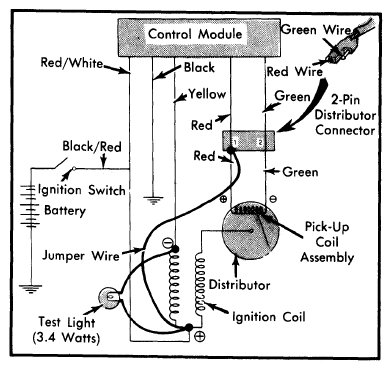 - Connect a test light (3.4 watts) to the ignition coil positive and negative terminals. See Fig 1. Attach one end of a jumper wire to the positive terminal of the ignition coil. Disconnect the 2-pin distributor connector.