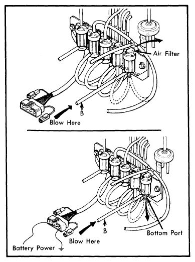 Disconnect vacuum sensing tubes from 3-way solenoid valve and vacuum pipe. Blow through vacuum tube "B" shown in Fig 1. Air should escape through solenoid air filter. Disconnect electrical connector from solenoid and apply battery power to connector as shown in Fig 1. Blow through hose again; air should escape through bottom port. If valve does not respond as outlined, replace 3-way solenoid valve.