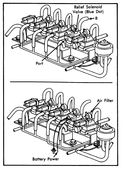 - Disconnect electrical connector from relief solenoid valve and connect battery power to solenoid terminals. Blow through vacuum hose again. Air should pass through valve and escape through air filter. If valve does not respond as described, replace relief solenoid valve.