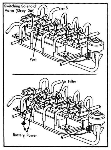- Disconnect electrical connector from switching valve and connect battery power to terminals on valve. Blow through hose again; air should pass through valve and escape through filter at rear of valve. If switching valve does not respond as described, replace switching solenoid valve.