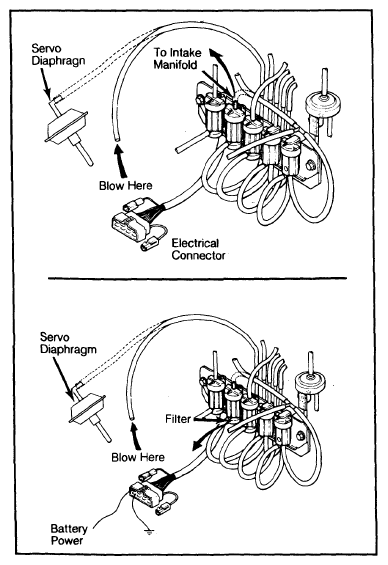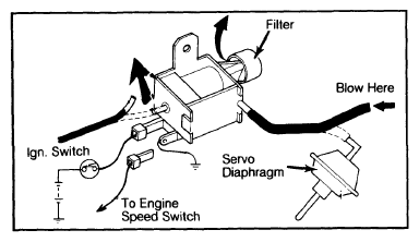 3. Turn ignition switch "ON". Blow air through hose disconnected from servo diaphragm; air should escape at solenoid filter.