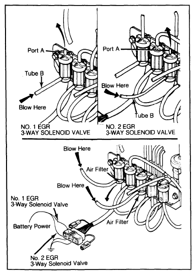 - Disconnect vacuum sensing tubes from solenoid valve and vacuum pipe. Blow through tube "B" shown in Fig 1. Air should pass through valve and escape through port "A".