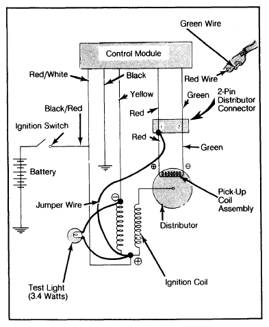 - Connect a test light (3.4 watts) to the ignition coil positive and negative terminals. See Fig 1. Attach one end of a jumper wire to positive terminal of ignition coil. Disconnect the 2-pin connector.