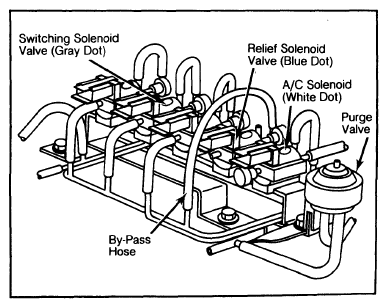 5. Reconnect by-pass hose at relief solenoid valve. Using throttle, set engine speed at 2500 RPM. Disconnect vacuum sensing tube from switching solenoid valve (Gray color dot).
