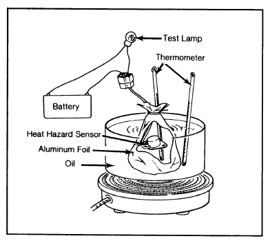 3. Connect a battery and test lamp to sensor connector. Test lamp should glow. Gradually heat oil. Test lamp should go out when temperature inside aluminum foil is 248-284°F (120-140°C). If sensor does not respond as outlined, replace heat hazard sensor.