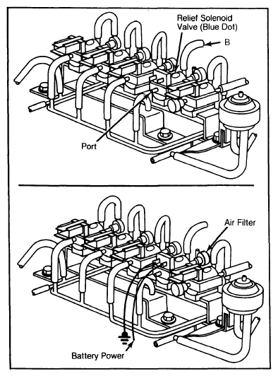 - Disconnect vacuum sensing tubes from relief solenoid valve and vacuum pipe. Blow through solenoid valve from vacuum sensing tube "B" in Fig 1. Air should pass through valve and escape from front port.