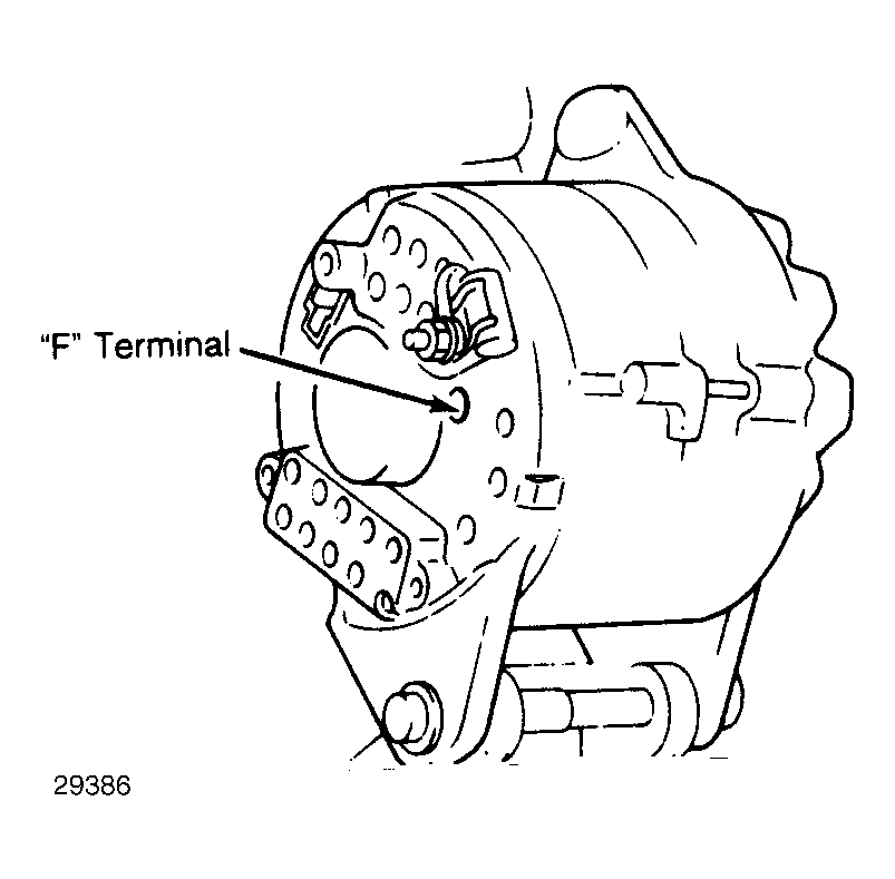 - If voltage at "L" is close to battery voltage with ignition on, short circuit the "F" terminal to rear alternator housing. See Fig 1.