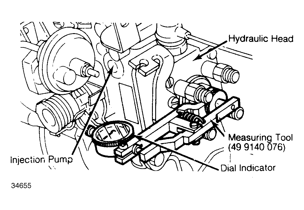 - Mount the injection timing measuring device (49 9140 076) into the hydraulic head plug hole. With the tip of the measuring tool firmly against the pump plunger, set the dial indicator to read about .08" (2 mm). See Fig 1 .