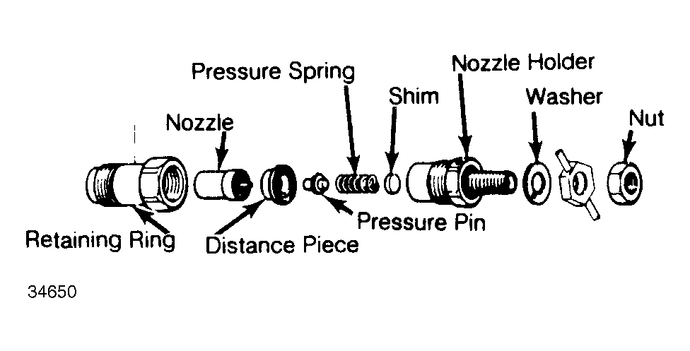 Injector opening pressure is adjusted with a shim on top of the needle valve return spring. See Fig 1 . The injector receives a high pressure pulse of fuel which forces open the needle valve allowing the fuel to pass into the prechamber.