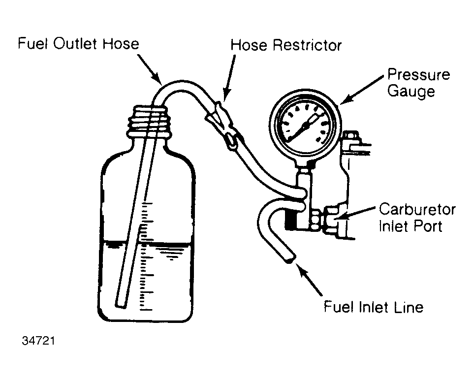 - Remove air cleaner assembly and disconnect fuel line at carburetor. Connect pressure gauge with restrictor and a flexible hose. See Fig 1 . Turn ignition on and briefly vent the system into container by opening hose restrictor.