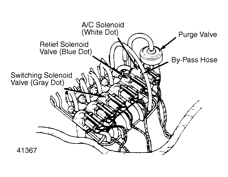 - Reconnect by-pass hose at relief solenoid valve. Using throttle, set engine speed at 2500 RPM. Disconnect vacuum sensing tube from switching solenoid valve (Gray color dot).