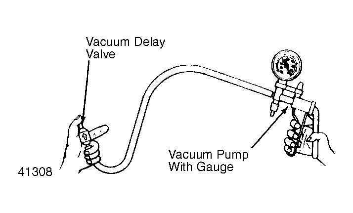 - Disconnect and remove vacuum delay valve. Connect hand-operated vacuum pump, with gauge, to inlet side of delay valve. Hold thumb over outlet side of delay valve and apply 19.7 in. Hg vacuum to delay valve. See Fig 1 .