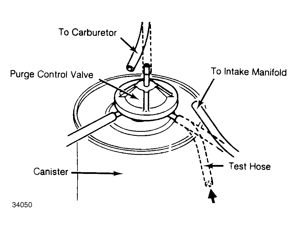 - Remove hoses leading to carburetor and intake manifold from purge control valve. See Fig 1 . Plug hose to intake manifold and run engine at idle.
