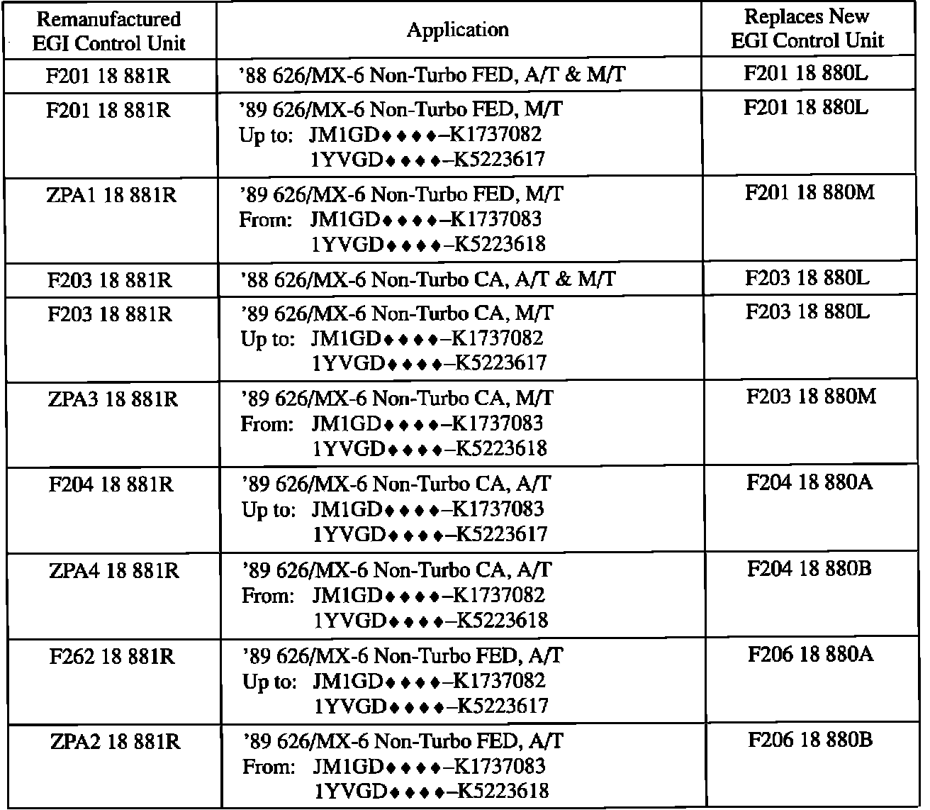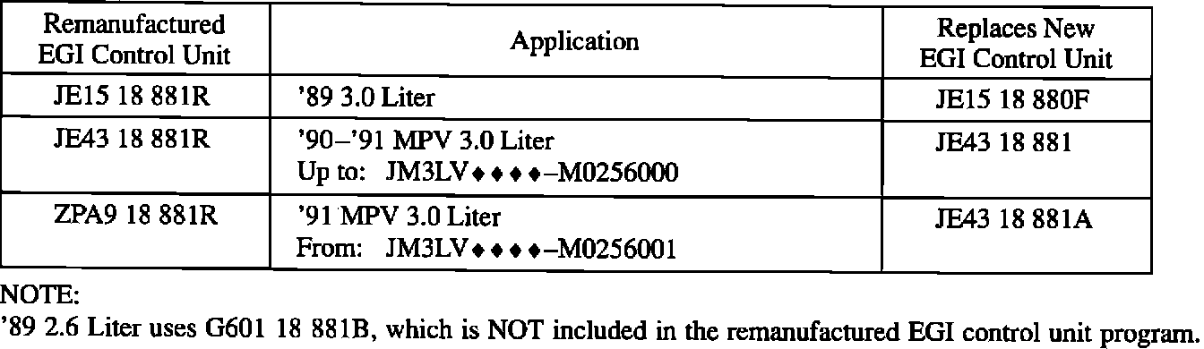 Remanufactured EGI control units for 1990 and 1991 year models have become available through the existing exchange program. The following Parts Information section shows the available remanufactured EGI control units for the following models: '86-'91 323/Protege, '86-'90 626/MX-6, '88-'91 929, '89-'91 MPV (except 2.6L), '90-'91 MX-5 and '84-'91 RX-7.