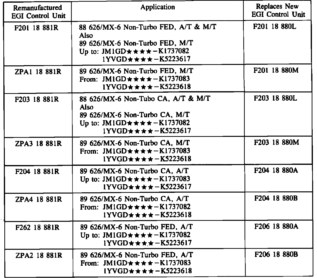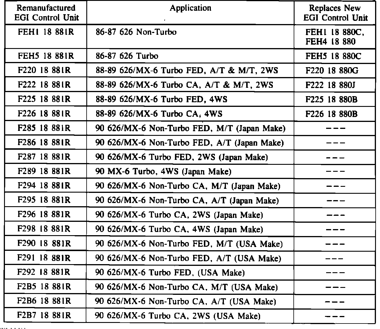 89 2.6 Liter uses G601 18 880A, which is NOT included in the remanufactured EGI control unit program.