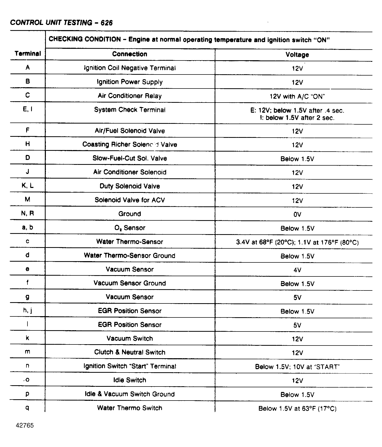 - The ECU may be tested using a voltmeter. Engine must be at operating temperature. For testing, ignition switch must be in "ON" position and engine not running. Measure voltage at each terminal and compare values to ELECTRONIC CONTROL UNIT TESTING chart. See Fig 1 .