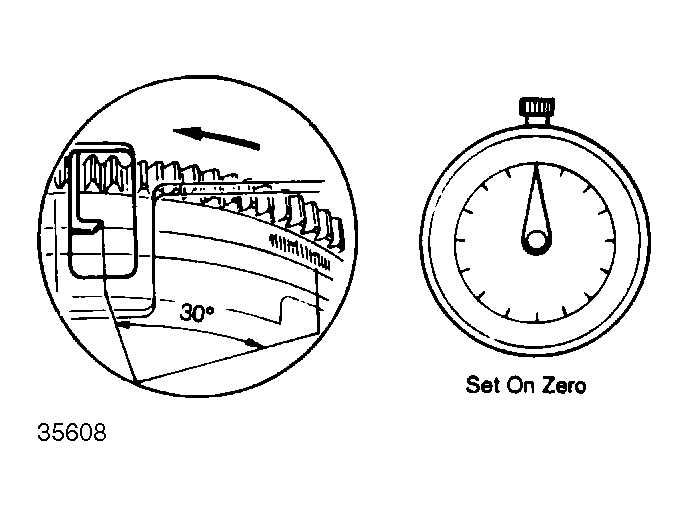 - Turn flywheel counterclockwise until timing mark on crankshaft pulley moves from TDC to 30-50° counterclockwise of TDC. See Fig 2 . Set dial indicator to zero. Now turn flywheel clockwise to align TDC timing mark on flywheel with indicator pin. If properly timed, dial indicator should read .0392-0408" (.98-1.02 mm).