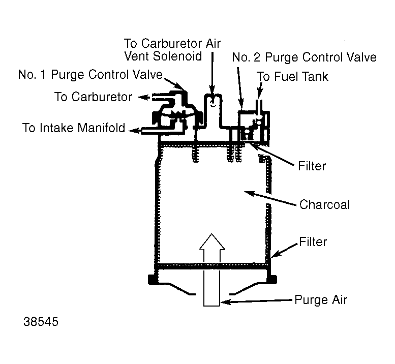 Remove upper and lower hose from No. 1 purge control valve. Apply direct manifold vacuum to upper valve port. Blow through lower valve port and air will flow through valve if working properly. See Fig 1 .