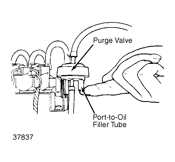 - Disconnect purge valve-to-oil filler tube hose from purge valve. Start engine and run at idle speed. Place finger over open purge valve port and feel that no vacuum is present. See Fig 1 .
