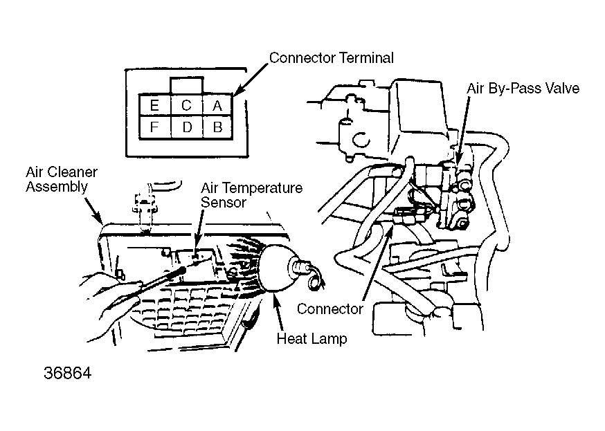 - Bring engine to normal operating temperature. Remove upper air cleaner cover assembly. With connector attached, connect voltmeter to the air by-pass valve side of connector at terminal No. E and ground. See Fig 1 .