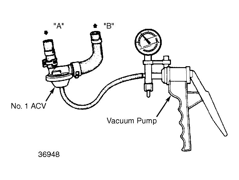 - With vacuum pump attached to No. 1 ACV, apply 15.6 in. Hg of vacuum to valve. Blow air into hose A. Ensure air emerges from hose B. If air does not emerge from hose B, replace No. 1 ACV.