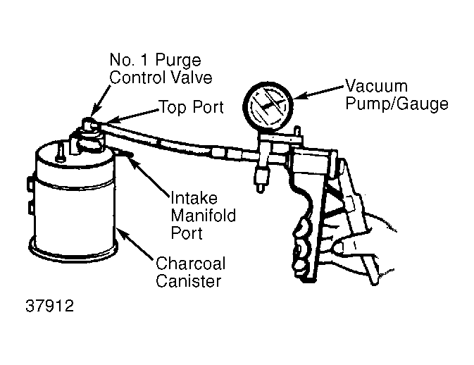 - To check No. 1 purge control valve, remove hoses from charcoal canister. Attempt to blow through intake manifold port. Air should not pass. Attach vacuum pump/gauge to top port of purge control valve. Apply 4.3 in. Hg vacuum. Blow through intake manifold port. Air should flow through port. See Fig 1